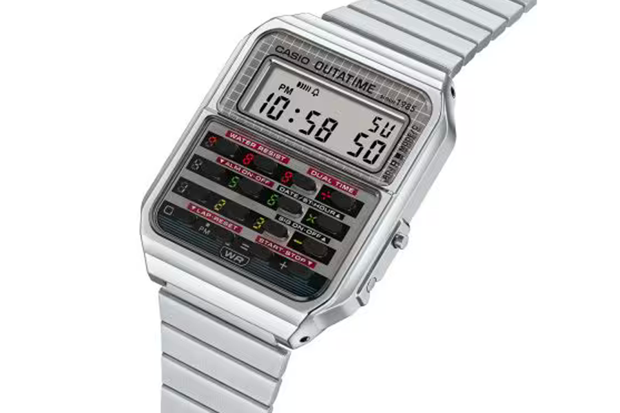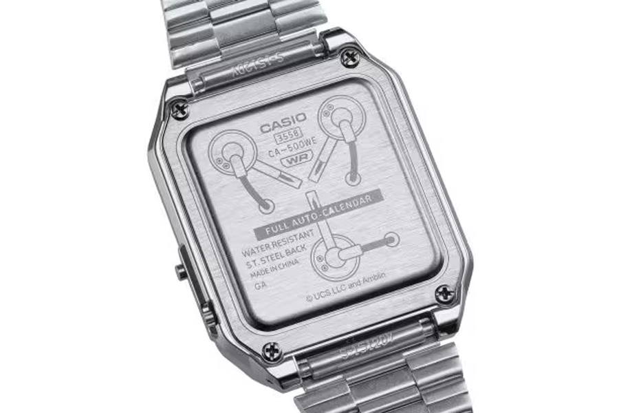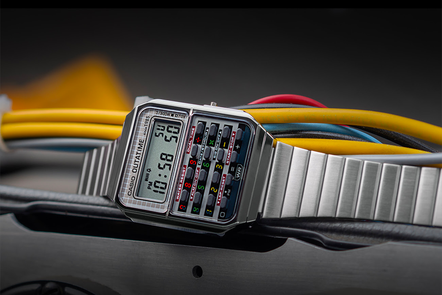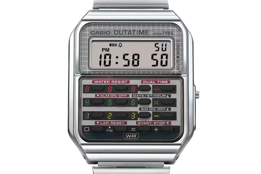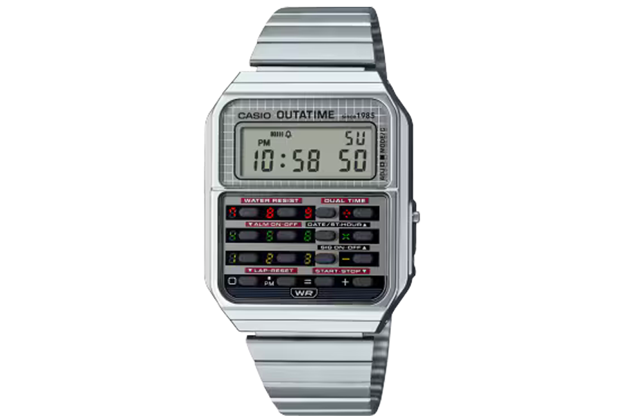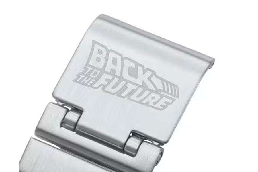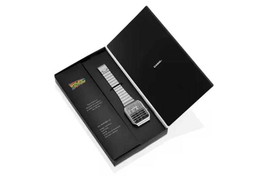 Cette collaboration en édition limitée célèbre à la fois l’âge d’or du cinéma des années 80 et l’innovation intemporelle de Casio. Basée sur la CA-500, la nouvelle version reprend la silhouette iconique du modèle d’origine, tout en y injectant une bonne dose de nostalgie futuriste. Le cadran et les boutons reprennent les codes visuels de la DeLorean : feux arrière rouges, circuits temporels et plaque OUTATIME. Sur le fond de boîte, le convecteur temporel est gravé avec précision, tandis que le logo Back to the Future orne l’ardillon, des détails qui font toute la différence.