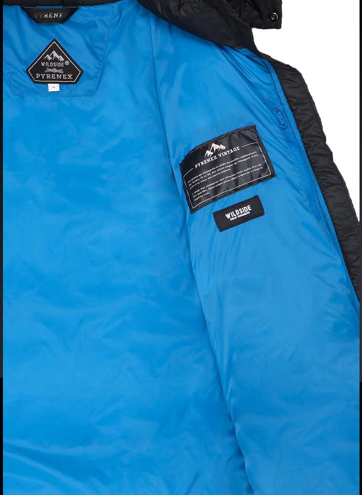La capuche intégrée et le col montant ajoutent une dimension cocon à la pièce, tandis que la doublure bleu clair, cachée sous une coque noire profonde, vient briser la rigueur monochrome — un détail signature, discret mais percutant. Sur la manche gauche, la griffe tricolore Pyrenex affirme son héritage, tandis qu’à droite, une étiquette noire WILDSIDE scelle l’esprit de la collab : dark, conceptuelle et radicalement contemporaine.