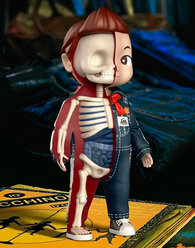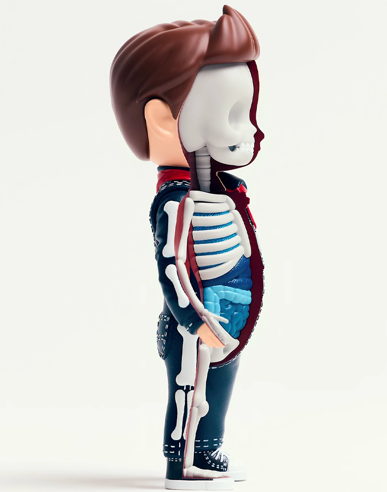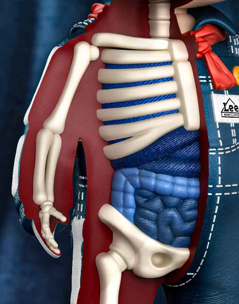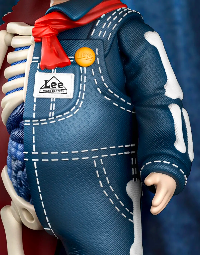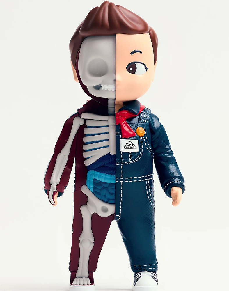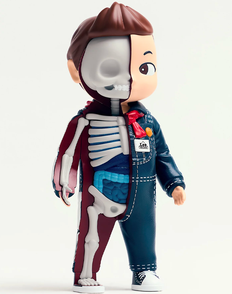 Pièce maîtresse de la collaboration, la figurine Buddy Lee XXRay imaginée par Jason Freeny s’annonce déjà comme un futur collector. Limitée à quelques exemplaires, cette sculpture de 9 pouces révèle un « intérieur denim » : un cœur et des organes stylisés en toile bleue, clin d’œil à l’ADN de Lee. Une pièce aussi conceptuelle que ludique, pensée pour les amateurs d’art contemporain et de street culture.