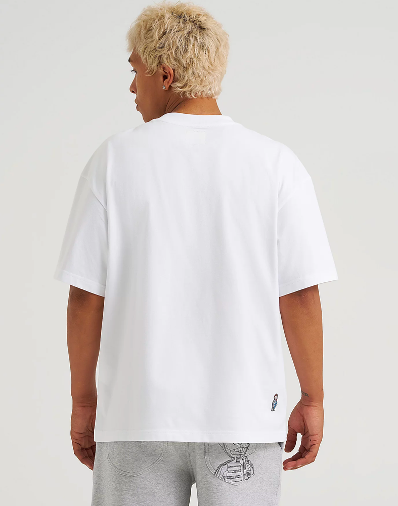 La collection capsule traduit cet esprit hybride à travers une série de pièces unisexes au croisement du streetwear et du collectible. Chemises à imprimé all-over ornées du logo XXRay, jeans wide-leg en denim clair, vestes oversize aux détails ton sur ton en forme de squelette, ou encore t-shirts graphiques bicolores jouant sur le contraste noir/blanc : tout y est pensé pour brouiller les frontières entre art et vêtement.