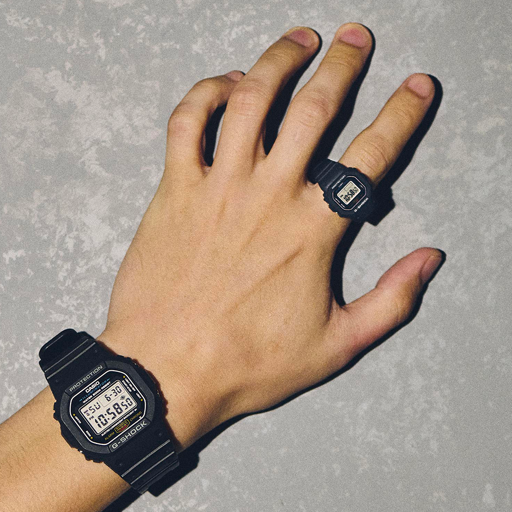 Ce n’est pas un gadget. La DWN-5600 est résistante aux chocs et affiche la même robustesse que ses grandes sœurs. Elle est également étanche jusqu’à 200 mètres, une première pour une bague digitale. Son écran reprend l’affichage classique des modèles G-Shock, avec les mêmes fonctions : heure digitale, calendrier, chronomètre au 1/100ᵉ, double fuseau, rétroéclairage LED, le tout encapsulé dans un boîtier en résine biosourcée renforcée. Les boutons en acier inoxydable, la lunette en uréthane et le fond vissé rappellent l’esthétique industrielle qui a fait la légende de la marque. L’anneau qui entoure le doigt adopte la même logique : perforations inspirées des bracelets de montre, ajustement précis, sensation de légèreté maîtrisée.