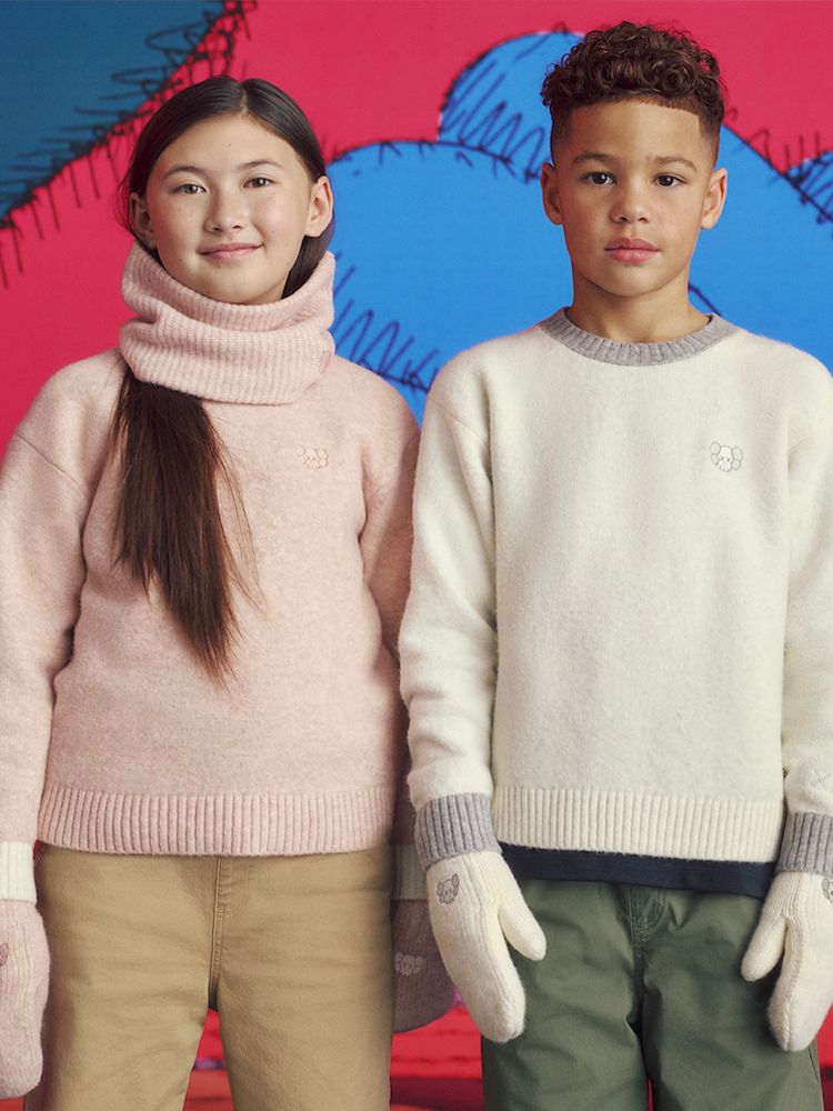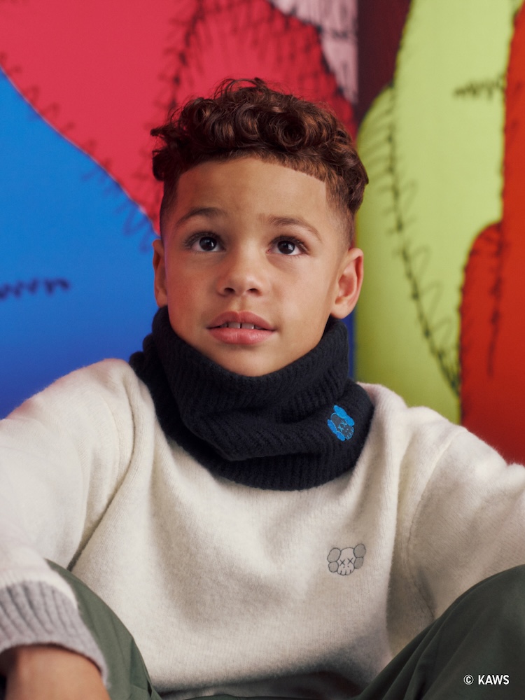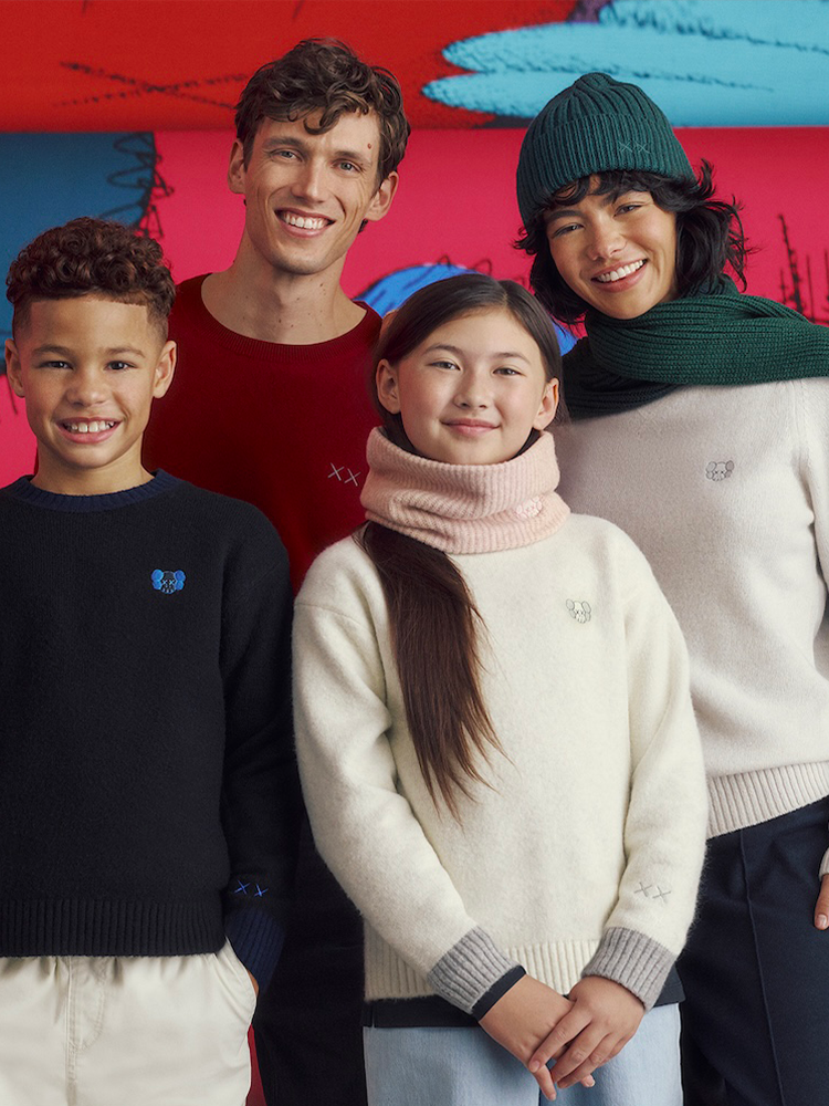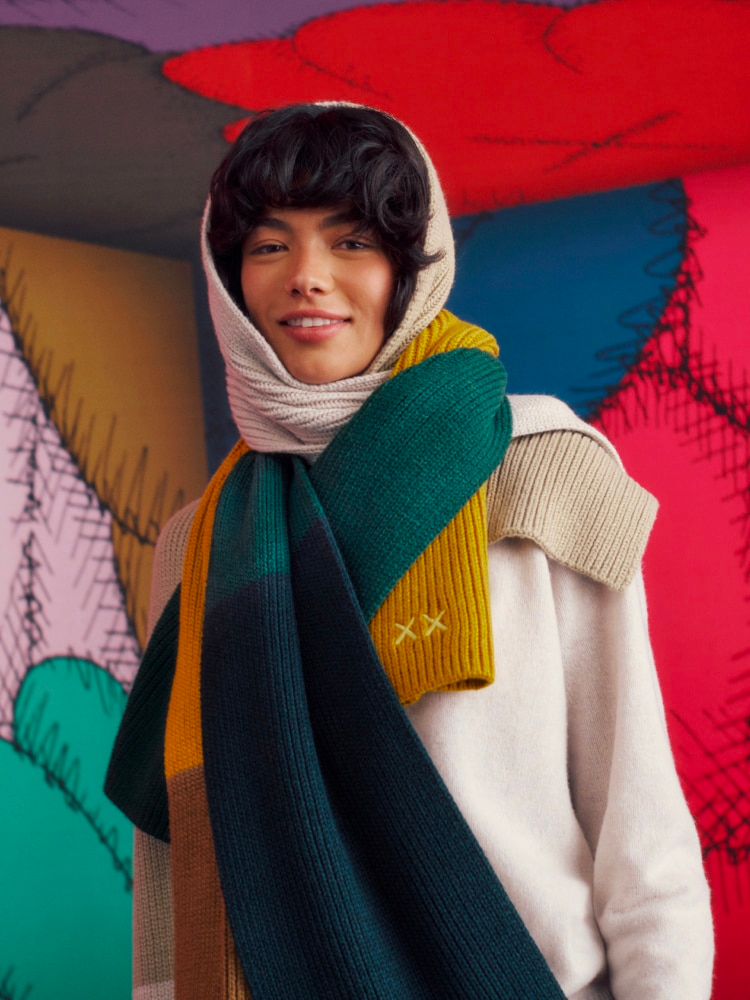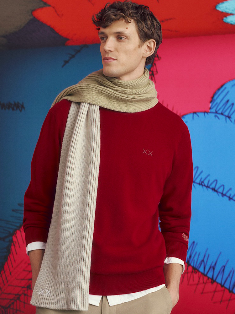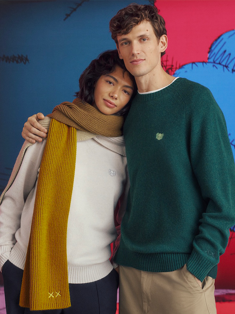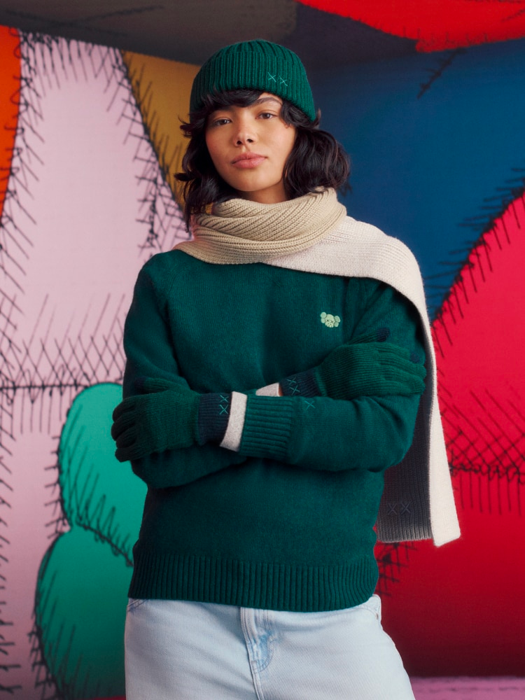 Pour cette capsule, l’artiste réinterprète ses personnages iconiques – ceux-là mêmes qu’on a récemment vus réincarnés en versions Sesame Street – et les transpose sur des pulls, écharpes et accessoires hivernaux. Le résultat : une esthétique festive revisitée, plus mature et plus raffinée, qui mixe l’esprit des fêtes avec le langage visuel immédiatement reconnaissable de KAWS. Rouge, vert, jaune : la palette classique du holiday season est twistée pour s’inscrire pleinement dans l’univers LifeWear de UNIQLO.