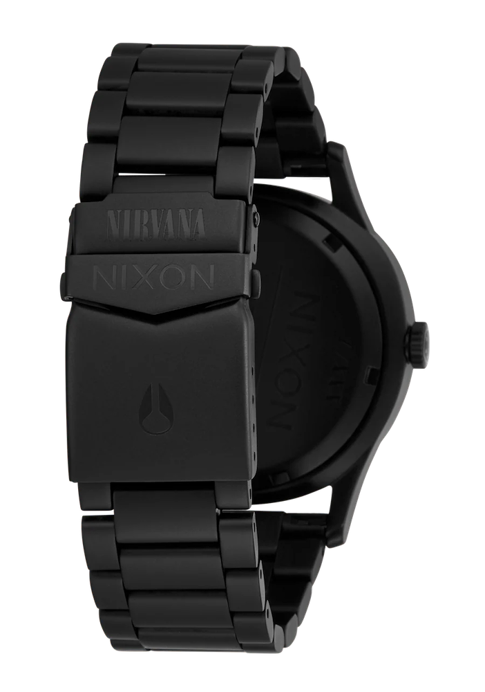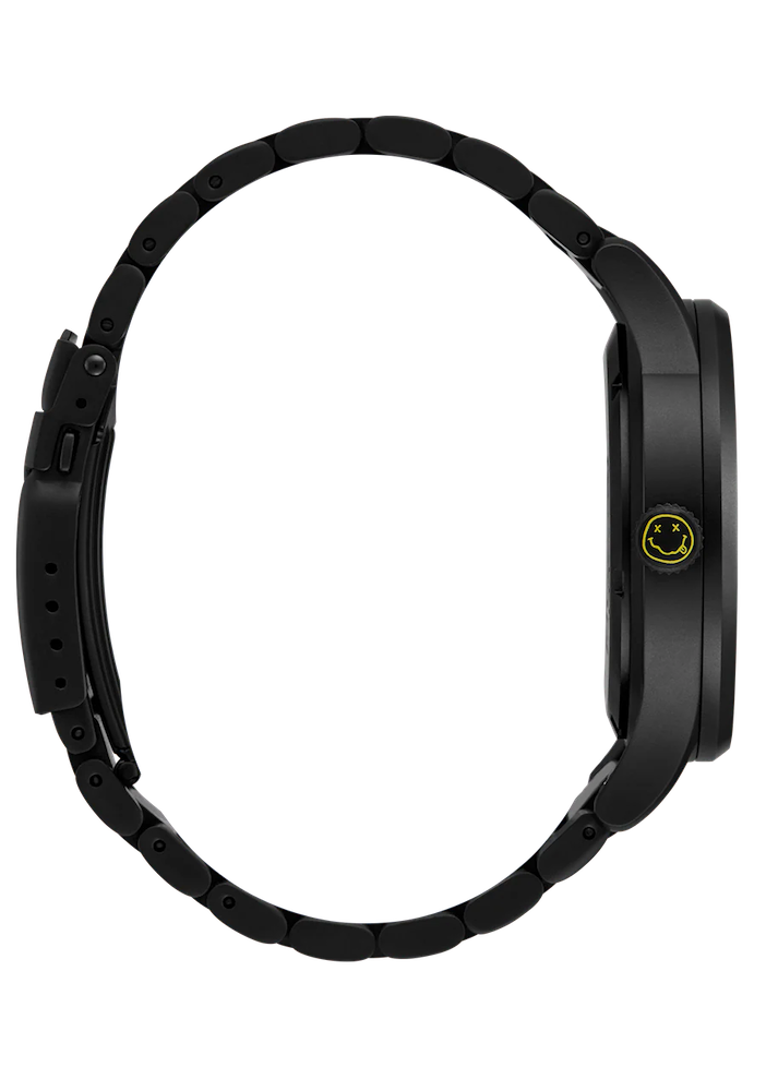Au centre du cadran, presque fantomatique, le smiley iconique de Nirvana s’affiche en ton sur ton, un clin d’œil subtil mais immanquable pour les initiés. Le bracelet noir mat en acier inoxydable renforce le caractère brut et intemporel de la pièce, équilibrant parfaitement sophistication et attitude rock.