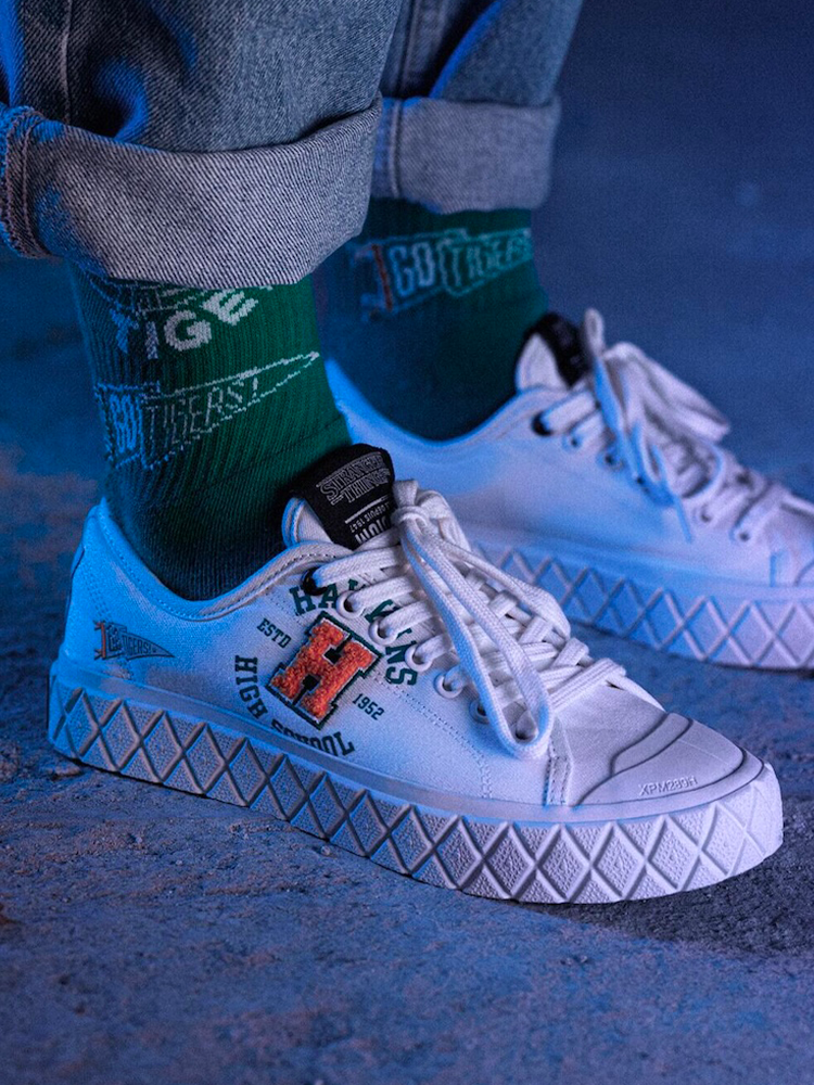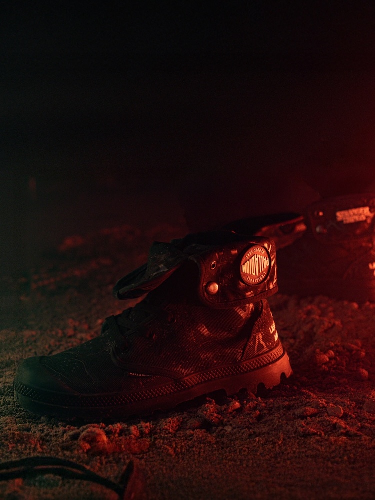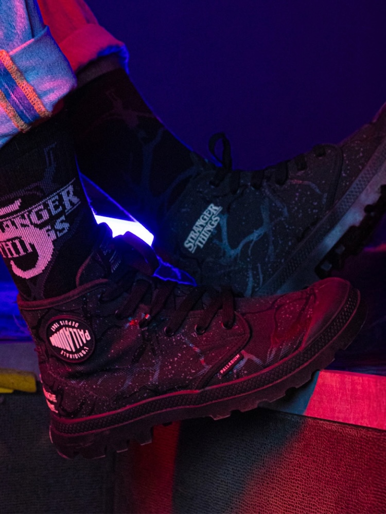 L’autre versant de la collection s’attache à la figure de Jim Hopper, protecteur implacable et cœur battant de la série. Palladium revisite ici son uniforme et son rapport à la résistance : toiles organiques camouflées, signes distinctifs de la police de Hawkins, plaques dorées sur les lacets en clin d’œil à son badge. Les déclinaisons Hopper Tunnels plongent quant à elles dans un univers plus souterrain, marqué par la poussière, le danger et la ténacité, un reflet direct du parcours du personnage dans cette saison ultime. Le résultat respire la robustesse, la loyauté et ce courage obstiné qui fait la marque de Hopper depuis 2016.