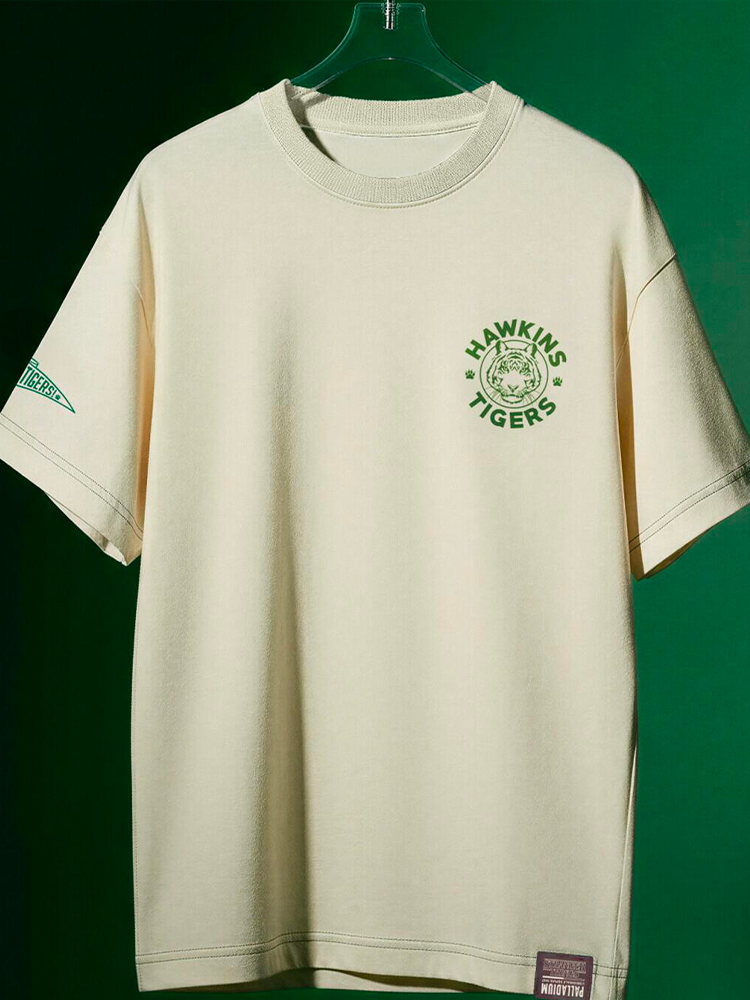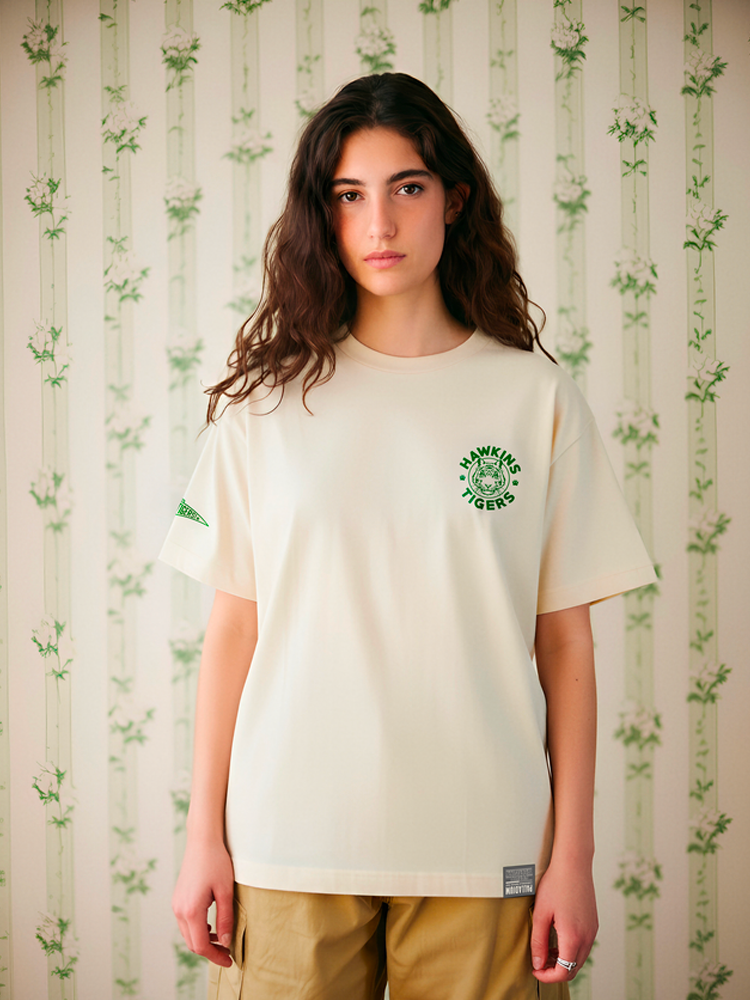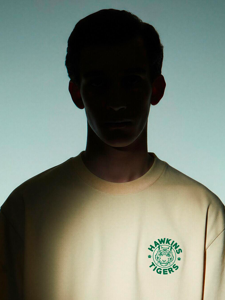 Ce drop final s’articule autour de deux axes esthétiques, chacun hommage à une légende de Hawkins. Le premier puise dans l’ADN varsity du lycée de la ville, entre fierté locale, esprit rebelle et camaraderie. On y retrouve l’univers des Hawkins Tigers revisité avec une précision quasi documentaire : jeux de textures, toile biologique inspirée des couleurs officielles de l’école, symboles brodés qui rappellent autant les équipes sportives que les vestiaires où se forment les premières alliances. La version Vines plonge ces codes dans l’obscurité de l’Upside Down, avec une toile noire striée de lianes phosphorescentes et des détails luminescents qui semblent sortir d’un couloir du laboratoire d’Hawkins. Une vision hybridée, à mi-chemin entre curiosité adolescente et menace surnaturelle.