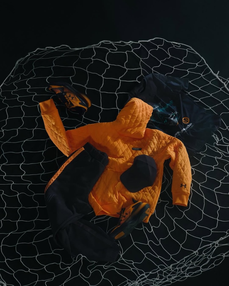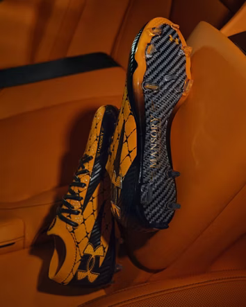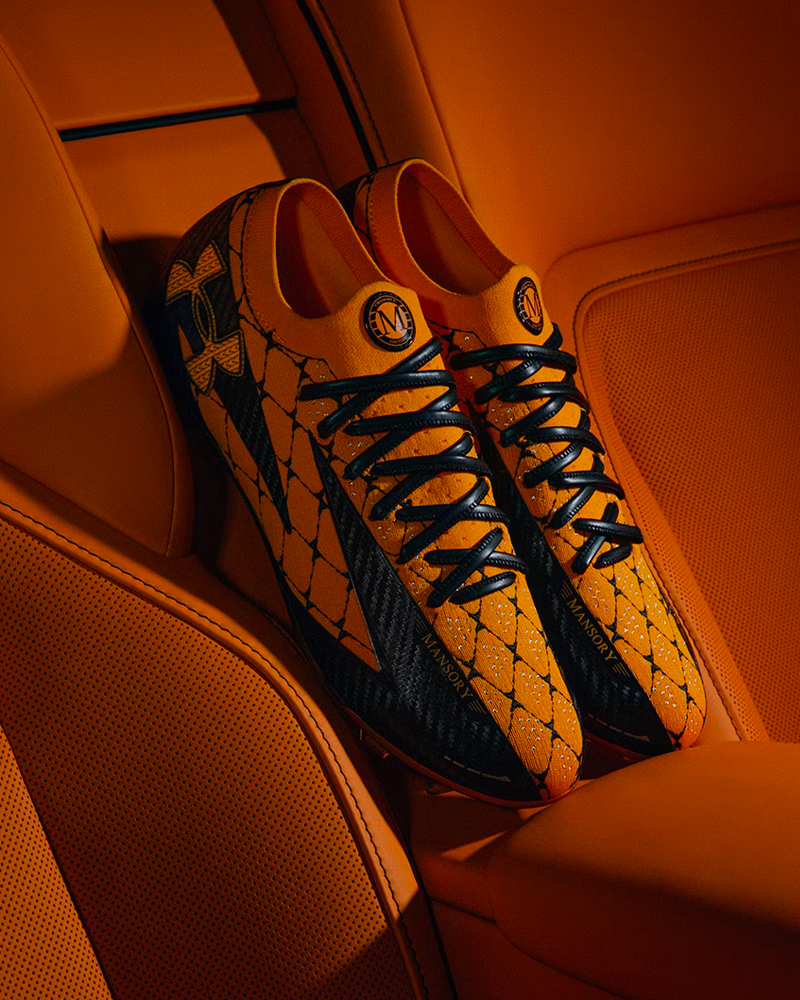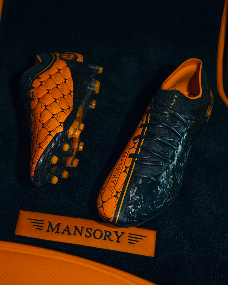 Pour le terrain, la collaboration réimagine les crampons Magnetico Elite 5 FG avec une tige qui simule la texture du carbone forgé sur la face extérieure. L’intérieur arbore un motif de grille orange, tandis que la semelle intègre une plaque en fibre de carbone. Les Shadow Elite 3 FG reçoivent un traitement similaire avec le même imprimé de grille, mais cette fois intervenu par des panneaux angulaires et tranchants en fibre. La semelle présente un dégradé progressif d’orange à noir pour finir le tout.