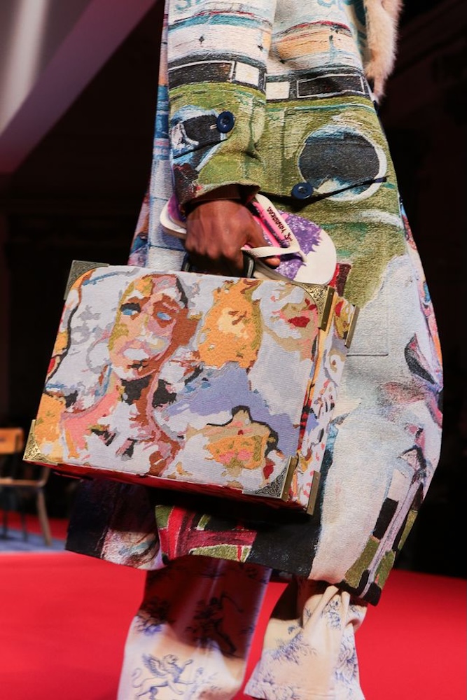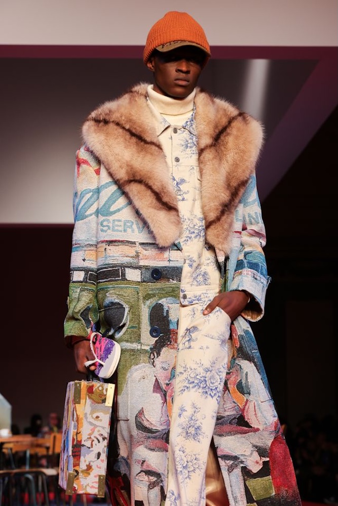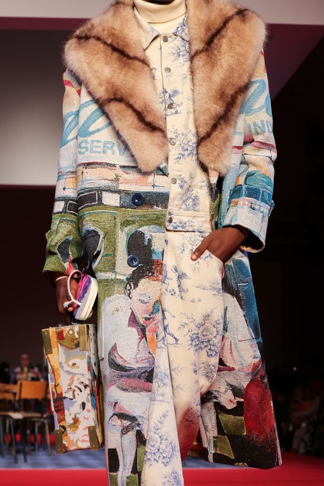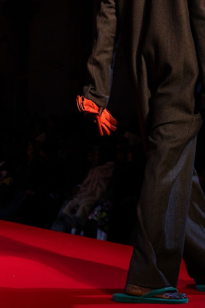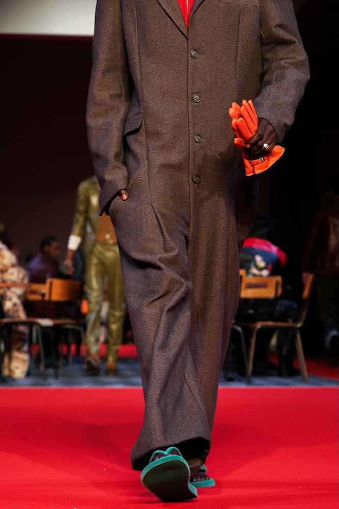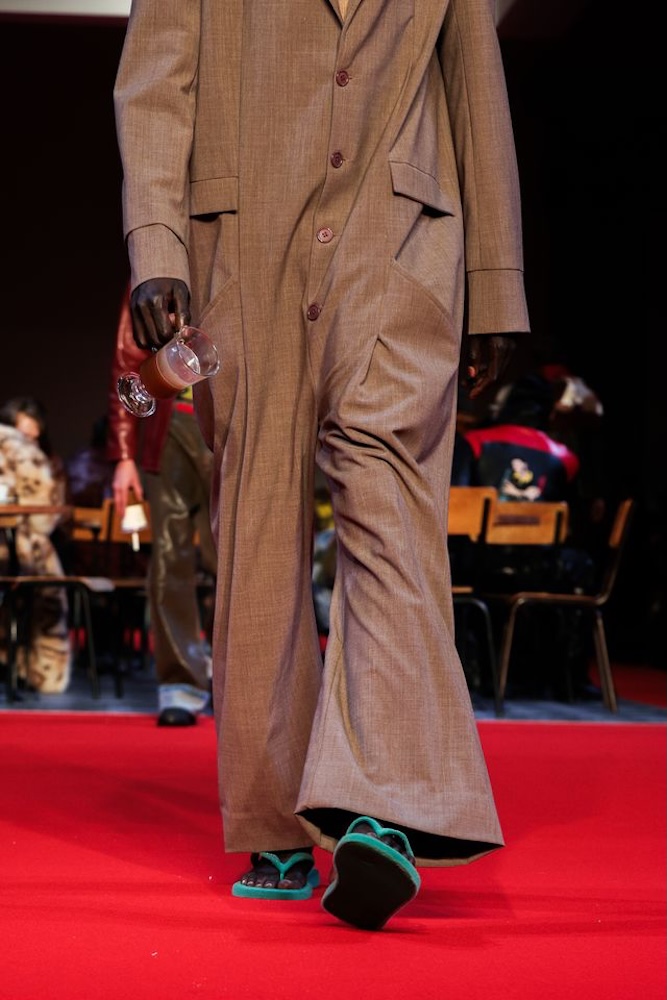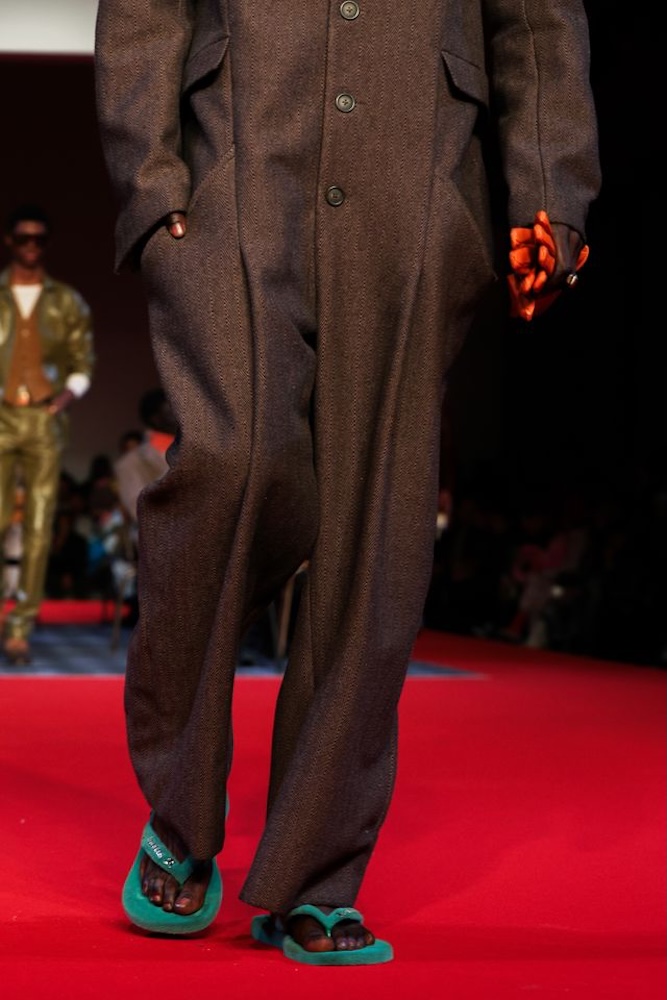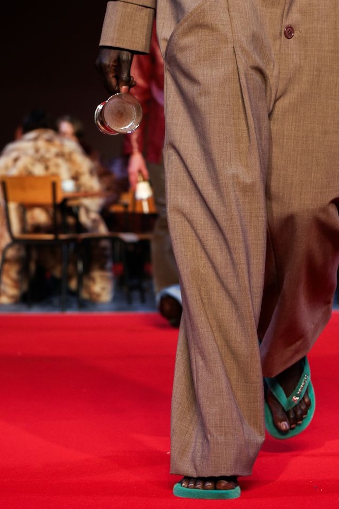 Cette création, baptisée Top KidSuper Turf Pitch, incarne parfaitement le terrain de jeu commun des deux univers. À la fois ludique, conceptuelle et résolument mode, la paire détourne un objet du quotidien pour en faire une pièce de défilé à part entière. Les logos havaianas et KidSuper, apposés en métal argenté, viennent signer ce design fort qui dialogue avec l’énergie narrative du show.
